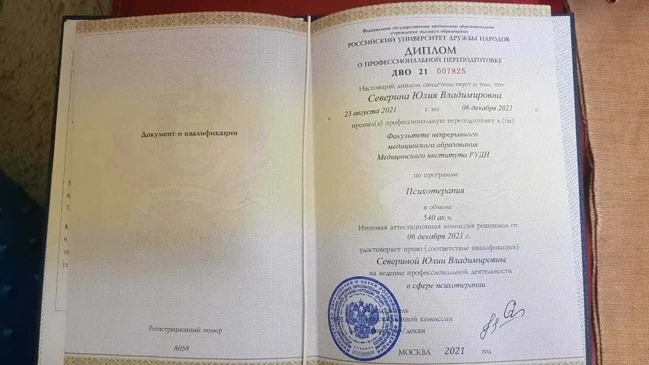 Профессиональная переподготовка по специальности "психотерапия" на базе РУДН.